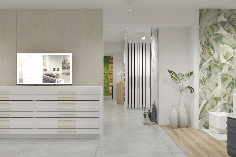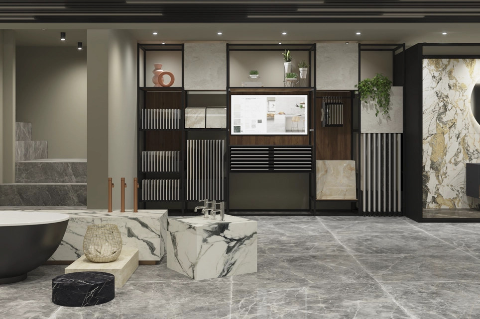 We integrate sensors in the drawers of the tile display stand, so that when a tray is removed, the display shows the ambience and the technical information of the sample exposed on the screen.